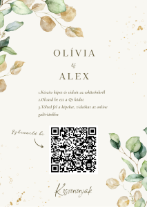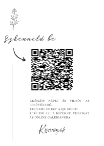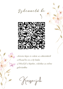 Miután megvásároltad a Qr kódot a termékoldalunkról, elkészítjük a saját galériád a neveddel, amit megadtál a rendelésednél, ezután készítünk egy Qr kódot és egy linket hozzá. Emailben elküldjük a Qr kódot a linkkel együtt és már használhatod is az esküvőn vagy más eseményen. A Qr kódot tetszés szerint felhasználhatod vagy mi is szívesen kinyomtatjuk neked. Ezekből a mintákból tudsz választani.